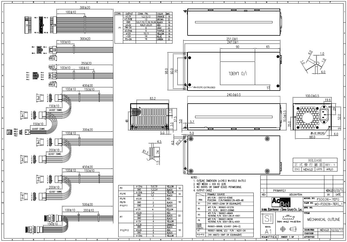 尺寸為 240 x 100 x 70 mm,設計緊湊、易於安裝,產品標籤上明確標示輸入參數、輸出功率與製造資訊,方便用戶識別與維護。FSD036-000G 是伺服器、工作站、網通設備與高效能工業設備的理想電源選擇。
