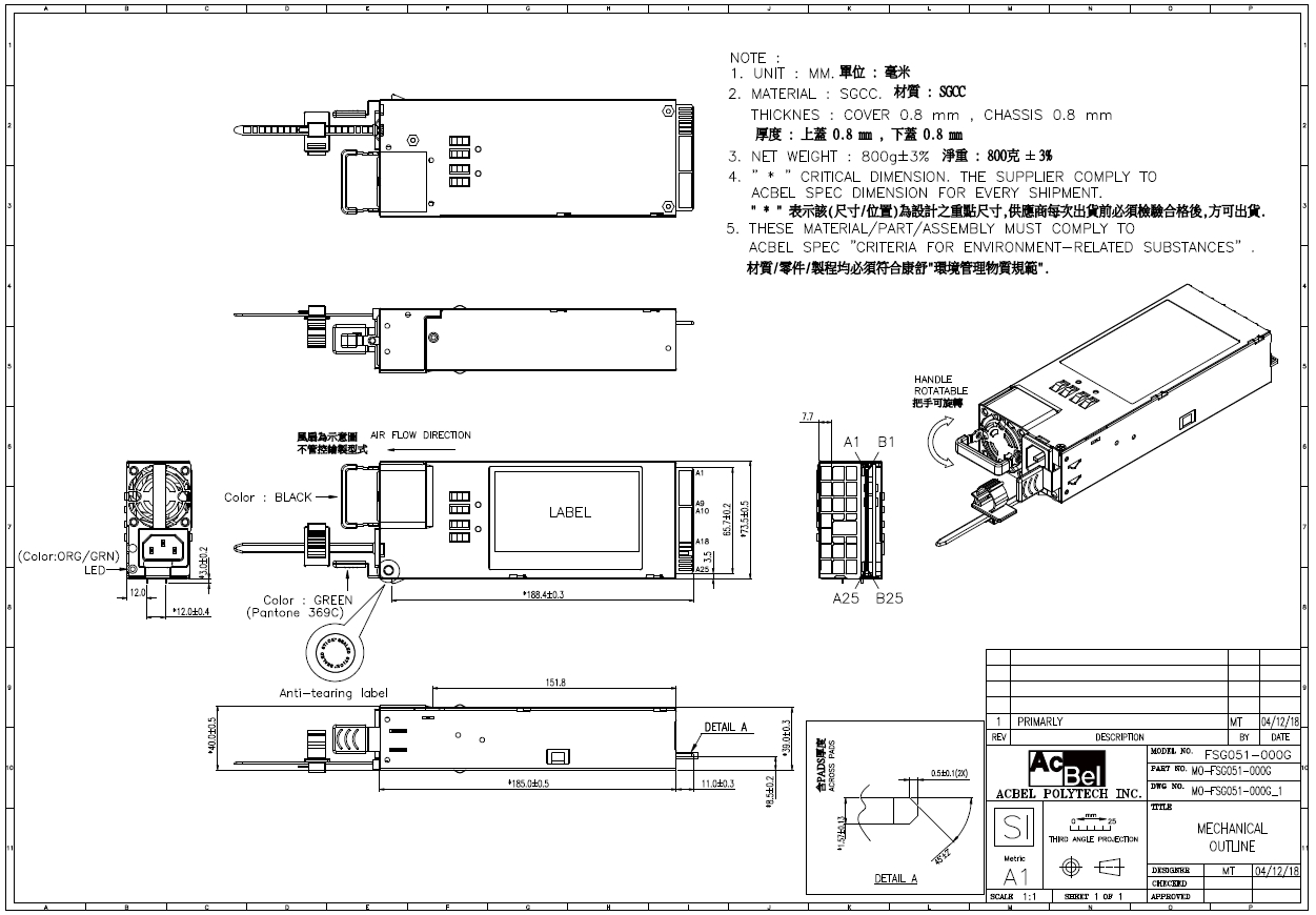 電源模組尺寸為 185 x 73.5 x 40 mm,採用2x25金手指卡槽連接設計,與常見伺服器主板高度相容,方便熱插拔與快速維修更換。