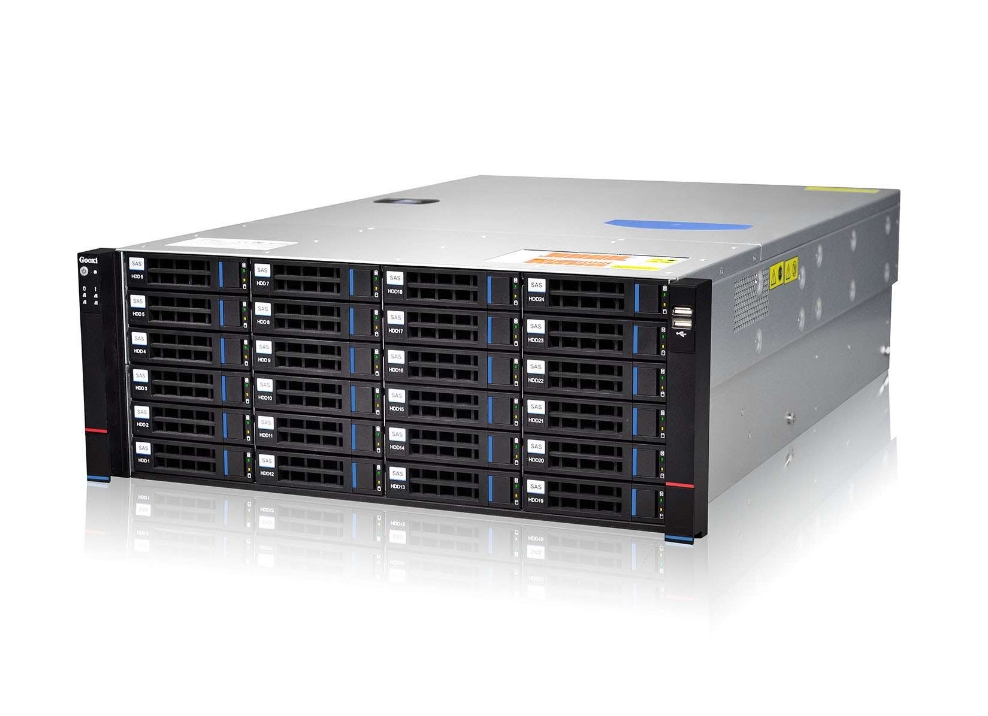 標配 24 顆 3.5 吋(或 2.5 吋)熱插拔硬碟位,2 顆 2.5 吋內置非熱插拔硬碟位,選配 2 顆 2.5 吋後置熱插拔硬碟位