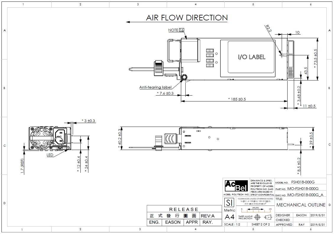 FSH018-000G 外觀尺寸符合標準 CRPS 尺寸(185mm x 73.5mm x 40mm),設計緊湊,可靈活安裝於 1U 或 2U 機架式伺服器機箱。內部配有高效能風扇,具備智慧調速功能,可依溫度變化自動調整轉速,在有效散熱的同時降低噪音。